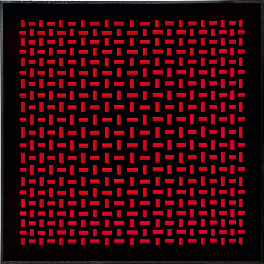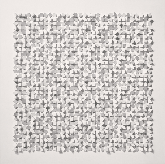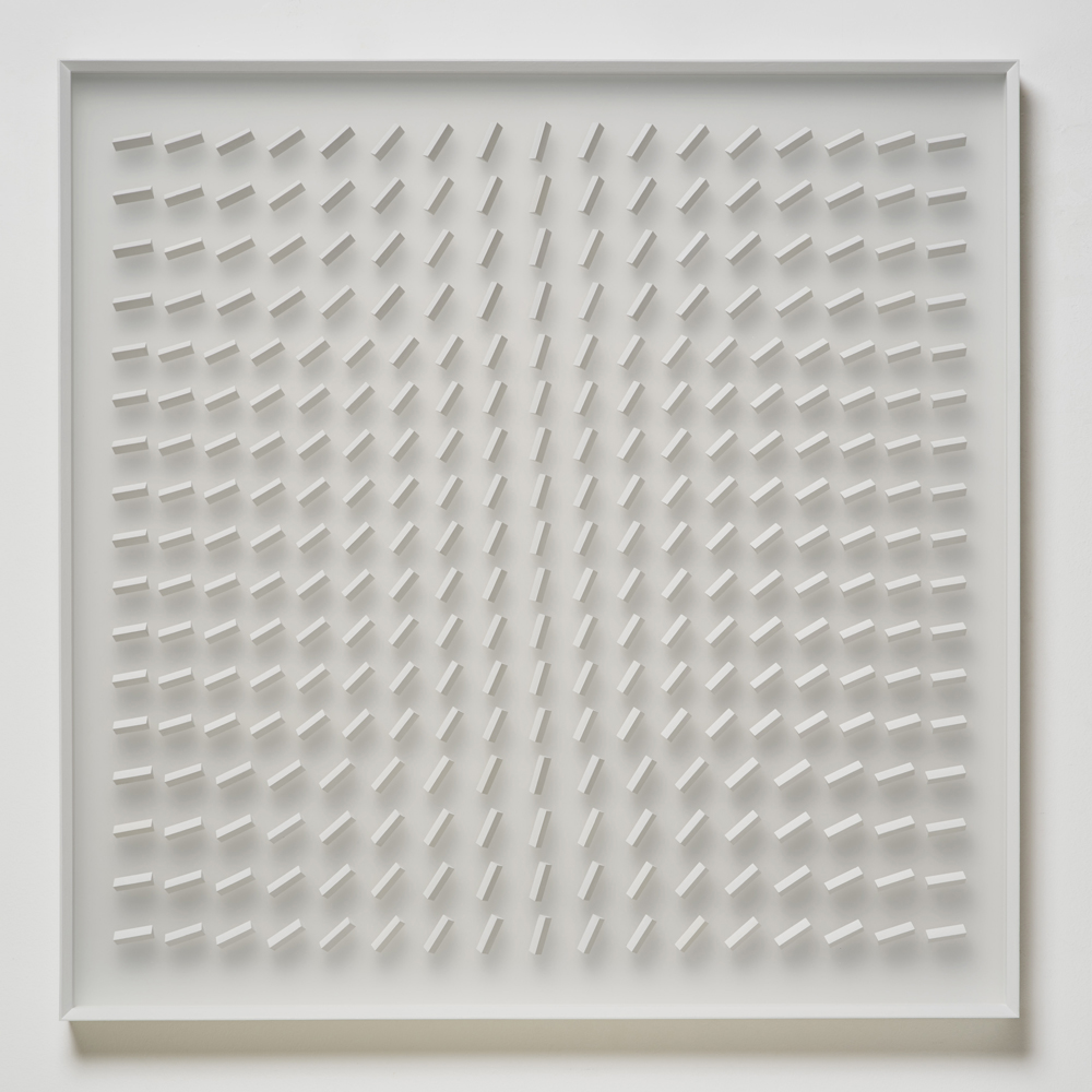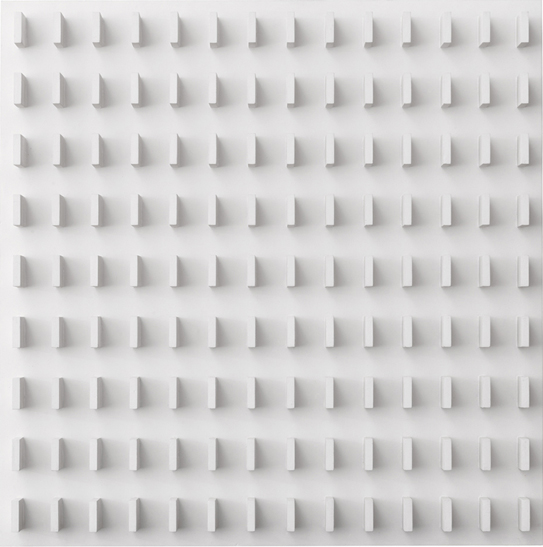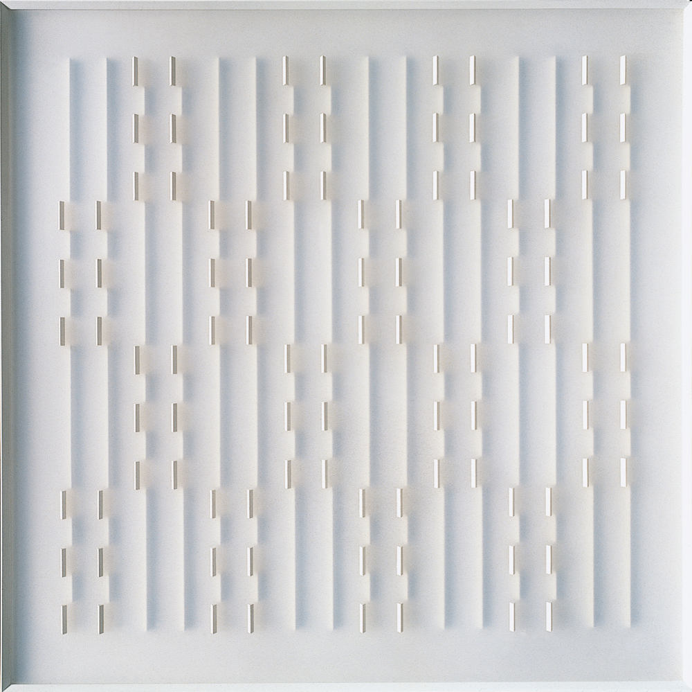 Zwei Aspekte sind dafür maßgeblich verantwortlich: Zum einen faszinieren die paradoxen Eigenschaften des Rasters, die sich überall in der Gesellschaft finden lassen und sinnbildlich für die Moderne stehen, und zum anderen lassen sich mithilfe von Rastern vielfältige kinetische und optische Effekte erzielen. In der Nachkriegskunst war ab 1960 ein wirklicher Neubeginn erfahrbar, der sich in den angesprochenen »Neuen Tendenzen« durch einen radikalen Bruch mit der Tradition – dem Punkt Null, dem Stadium Zero – manifestierte. Die Farbe Weiß wurde als Inbegriff einer solchen Purifizierung verstanden. Außerdem eignete sich Weiß ebenso wie das Raster besonders gut für Experimente mit Licht und Schatten im Bild. So diente beispielsweise Günther Uecker das Raster in seinen frühen Nagelbildern als anonyme Struktur, um eine emotionale, informelle Handschrift zu vermeiden, ebenso wie es etwa für Piero Manzoni wesentlich war, in seinen »Achromen«2 alltägliche, banale Objekte – meist in Weiß – seriell auf einen Bildträger zu montieren. Das Raster in seiner verdichteten Extremform konnte zudem optische Ereignisse wie den Moiré-Effekt auslösen und erlangte deshalb im Kontext der Op-Art große Bedeutung.3