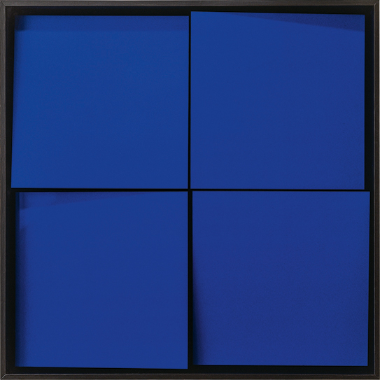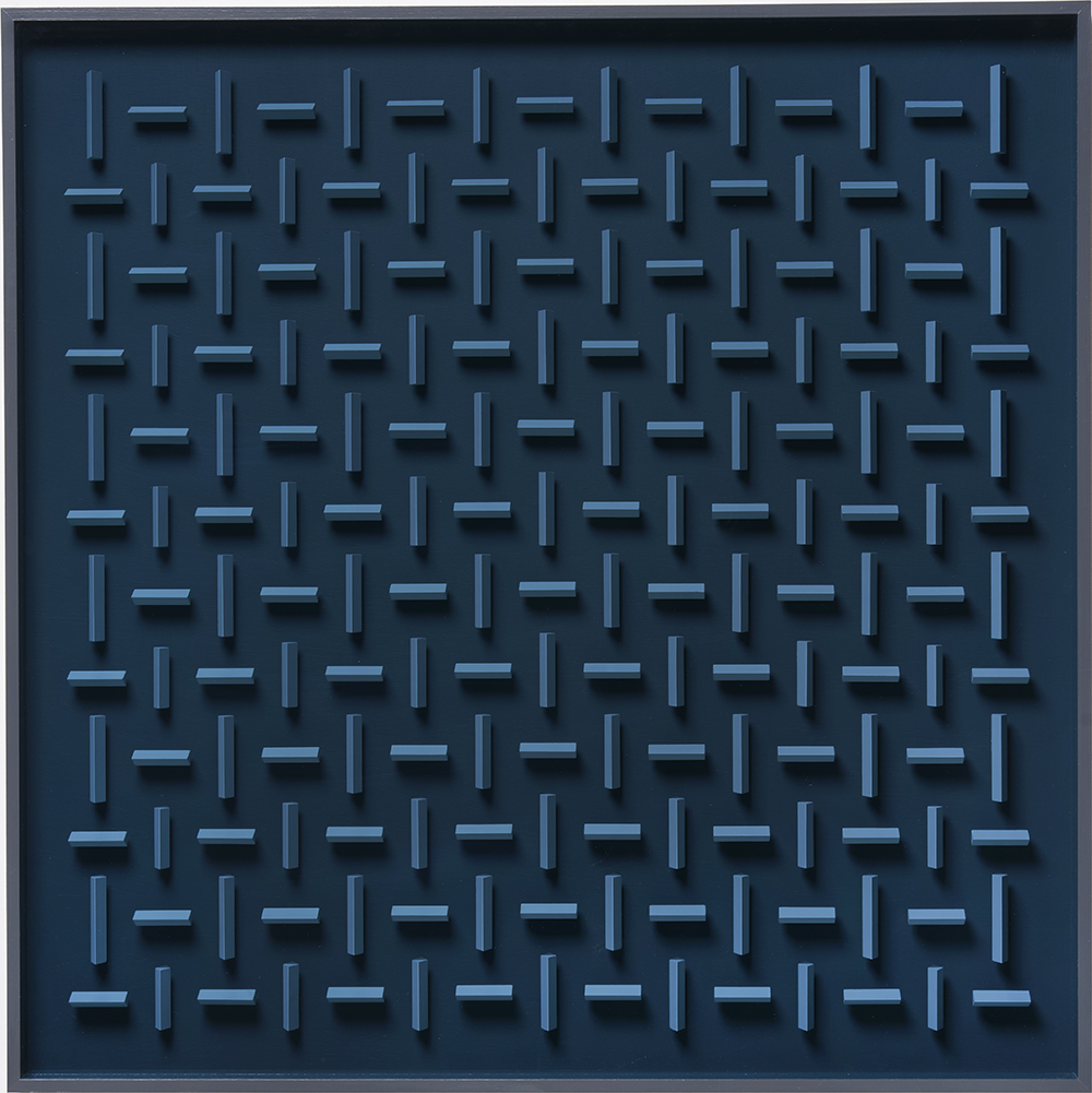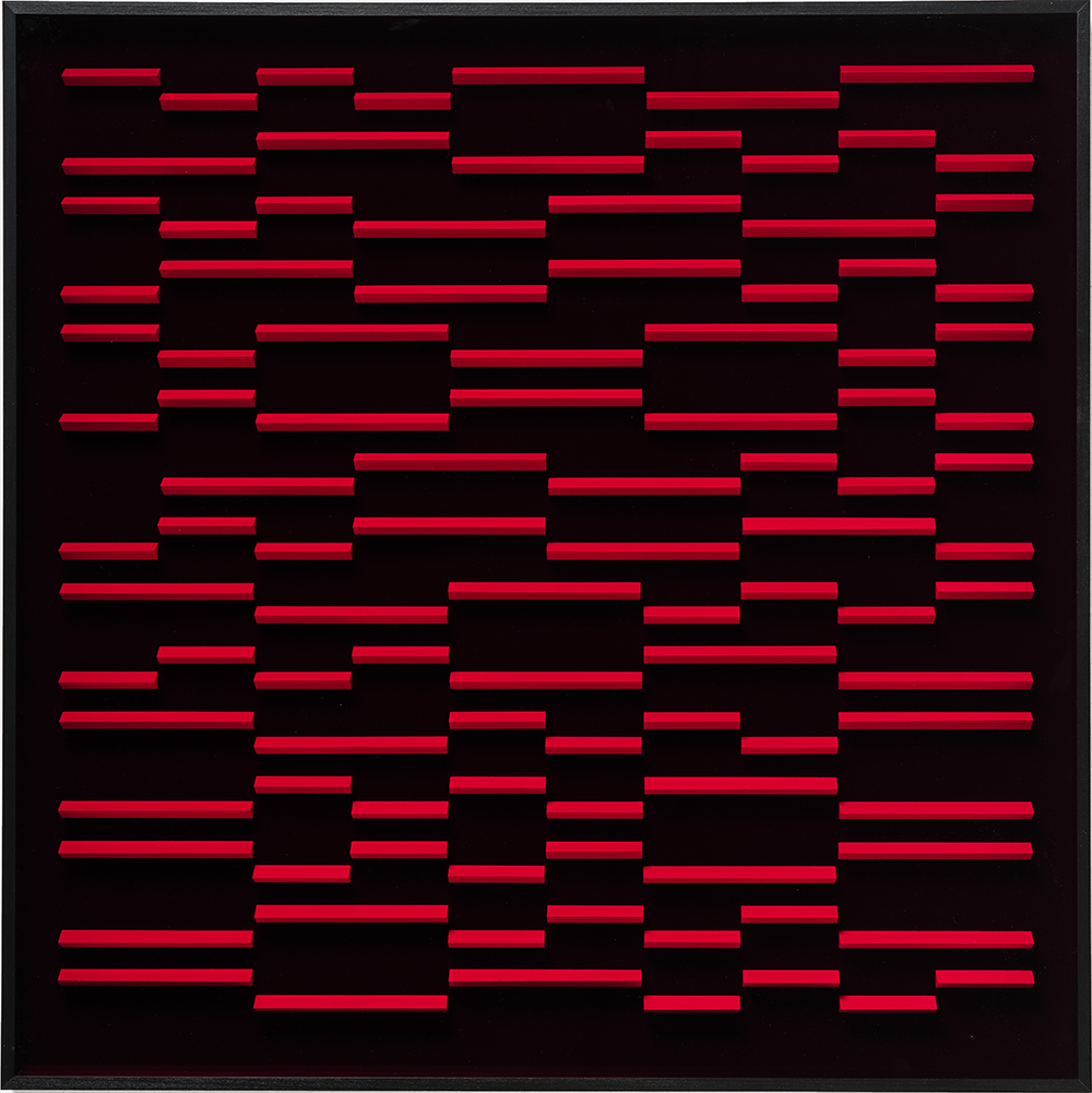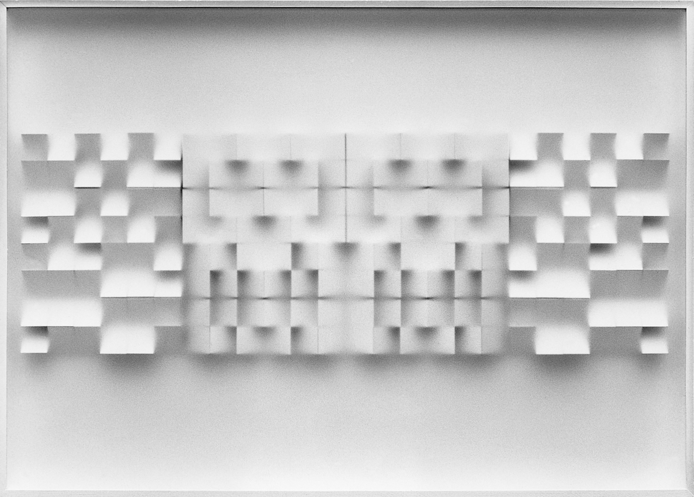 Es folgten weitere Reliefs, die seriell aufgebaut sind und durch ihre Titel zusätzlich in diese Richtung verstärkt werden: Regelmäßig (Maschinen-Relief 1) (Abb. 3) und Betont seriell (Abb. 4). In ihrer für die spätere Werkentwicklung untypischen Kleinteiligkeit und Fülle wiederholte er den immer gleichen Körper – Quadrat, Rechteck oder Dreieck – auf einer Trägerplatte. Aufgrund ihrer handwerklich perfekten Ausführung entsteht der Eindruck, dass die Reliefs eher einer industriellen Massenproduktion entstammen. Dieser Bezug zum industriell hergestellten Produkt ist in diesen Jahren für viele Künstler ein wichtiger Referenzpunkt, und das Thema des Rasters geht meist damit einher.