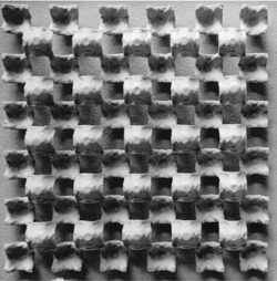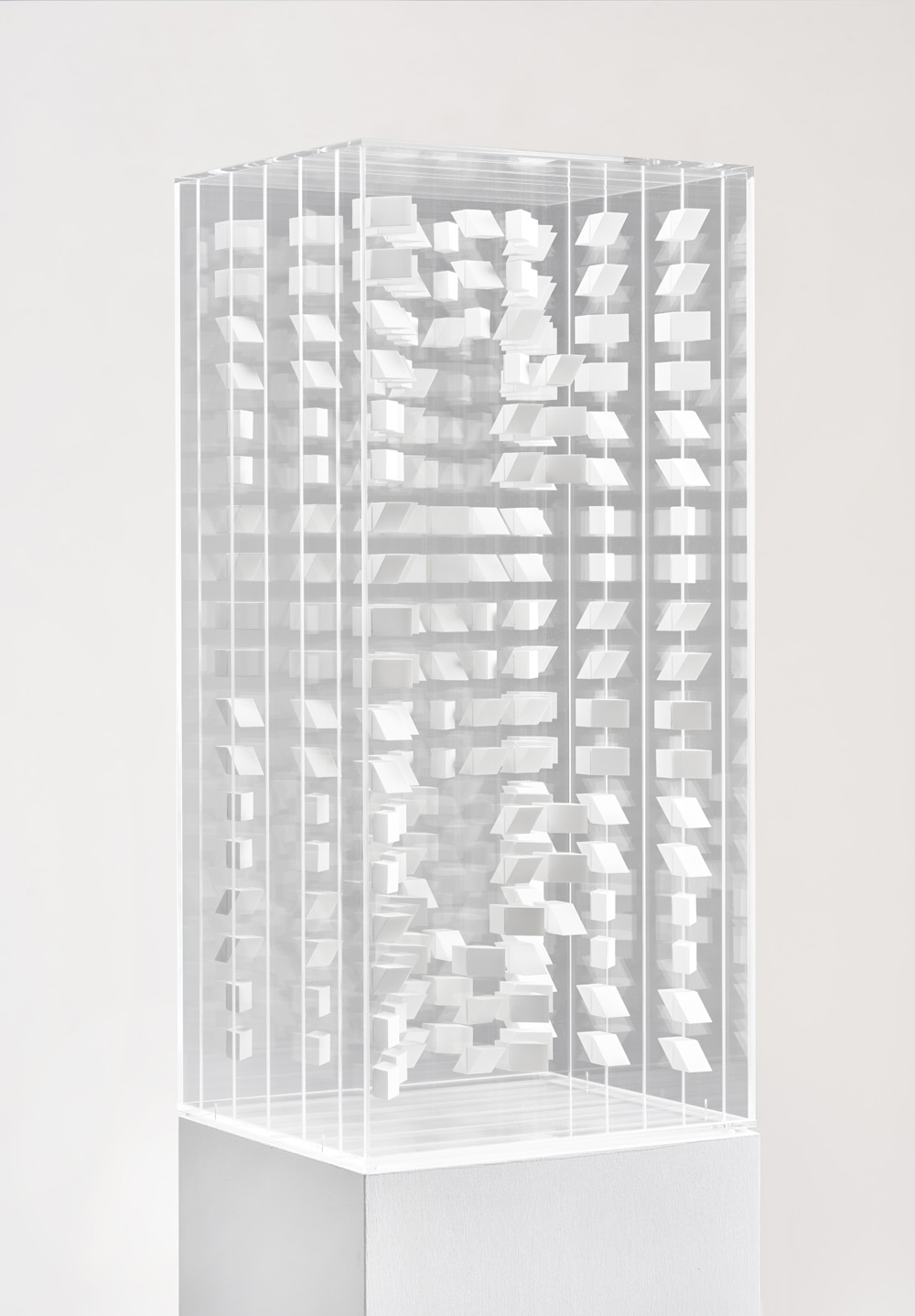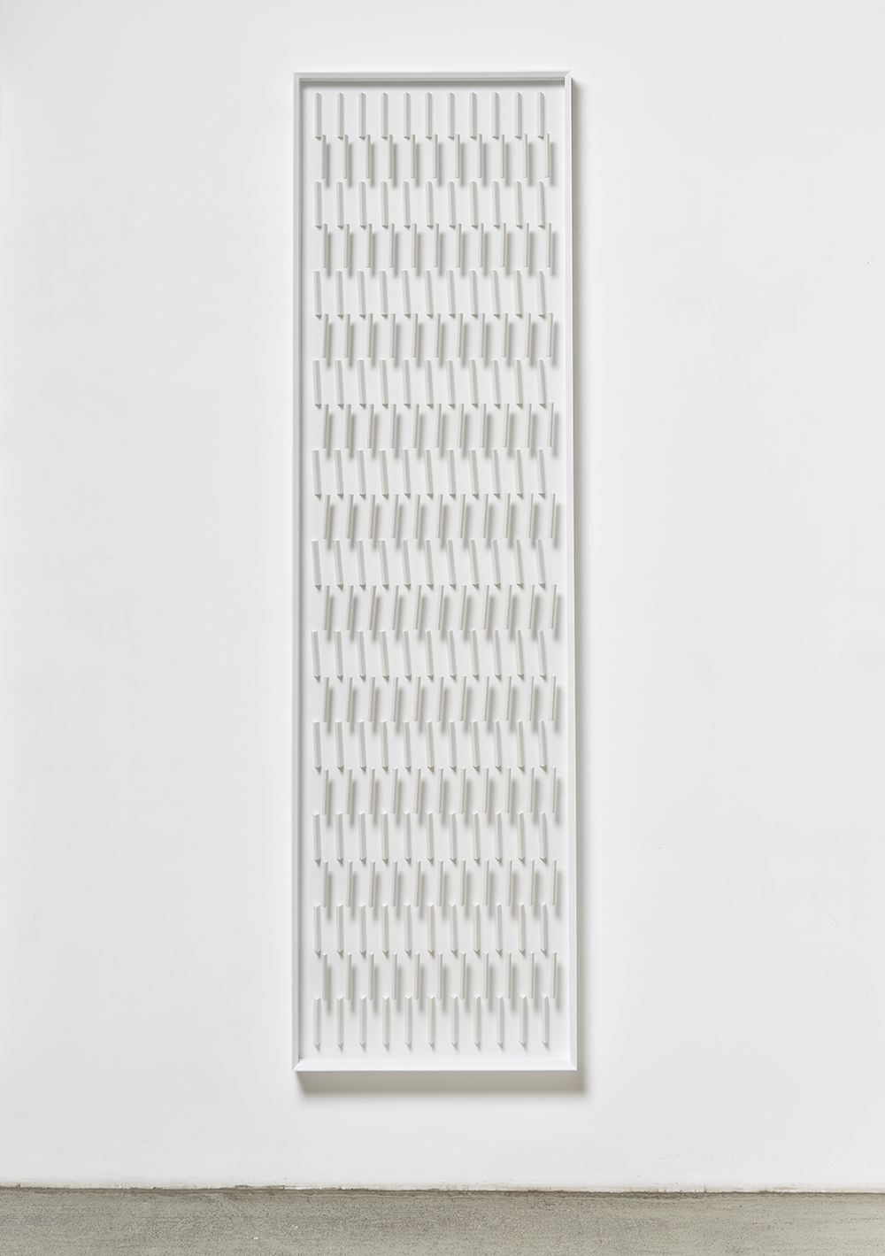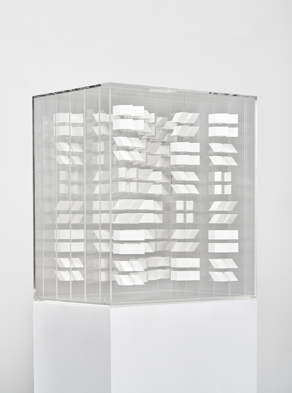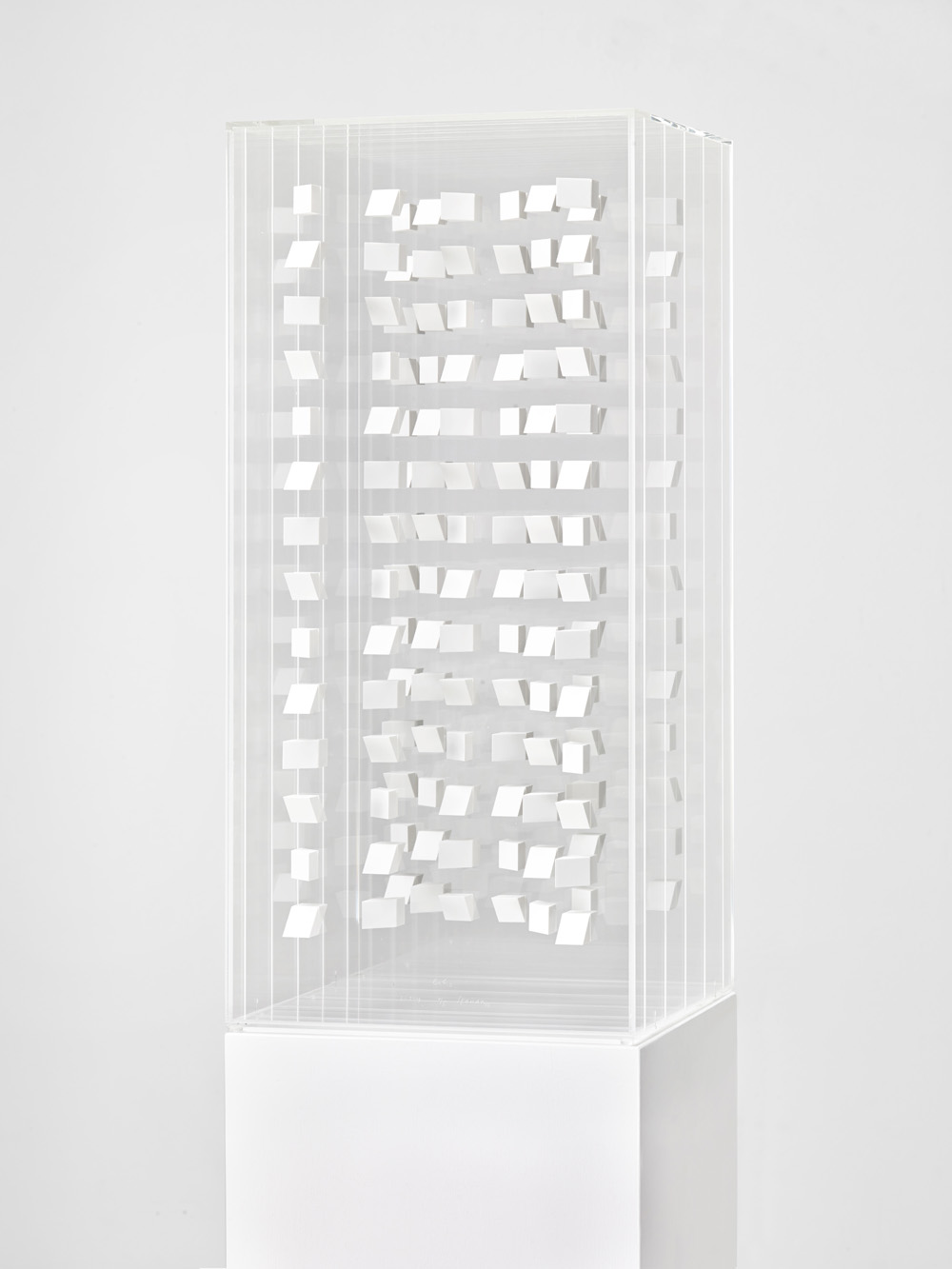 Die Doppelreliefs und Plastiken setzen das serielle Prinzip der Objekte freistehend in den Raum fort, indem die weißen Reliefstrukturen mehrschichtig gestaffelt hintereinander oder zu einem zentralen vierseitig-geschlossenen Strukturkern verdichtet sind.