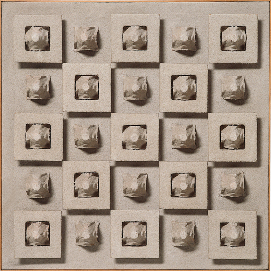 2 Manzoni begann die Serie der »Achrome« 1958. Er nutzte Watte, Federn, Wolle oder Teig und montierte diese Materialien im Raster auf dem Bildträger.