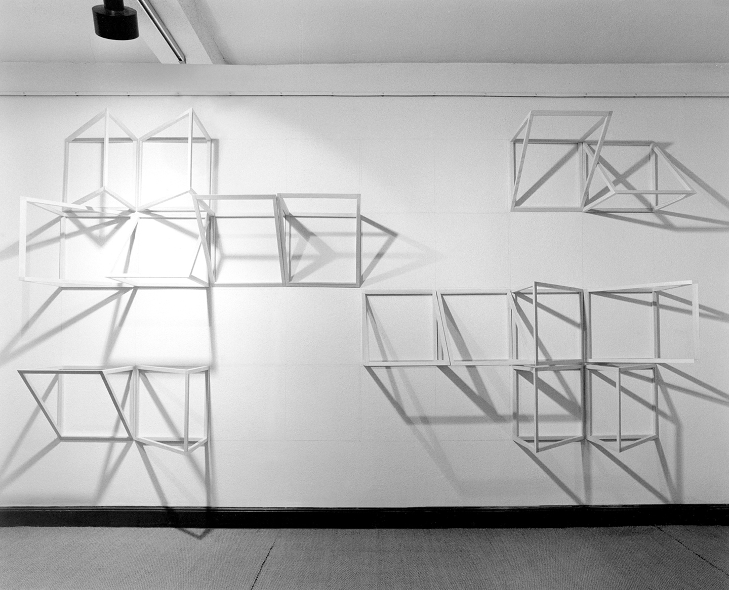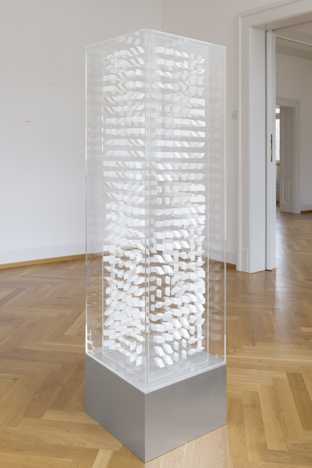 Es ist verblüffend, wie stringent und hellsichtig der Student Staudt bereits in den frühen 1960er Jahren sein Werk anlegte. Alles ist darin enthalten, was er bis heute weiterentwickelt und ausgebaut hat. Seine Zeit als Assistent und Meisterschüler von Ernst Geitlinger in den Jahren von 1963 bis 1965 und als Assistent von Georg Meistermann von 1965 bis 1967 nutzte er für die Formfindung im Raster. Er arbeitete nun nicht mehr mit Karton, sondern hauptsächlich mit Holz und Dispersionsfarbe. Die Anordnung gleichförmiger Elemente variierte er zunehmend in komplexer werdenden Systemen. Staudt begann die Elemente zu drehen, die Oberflächen zu neigen und zu kippen. Mal untersuchte er die Wirkung, indem er die Anordnung zufällig entstehen ließ, mal folgte er einer strengen Systematik. Eine Serie mit Zufallsentwürfen entstand bereits 1963: 34 × 34 kleine Prismen brachte Staudt mit unterschiedlichen Oberflächenneigungswinkeln auf einer 70 × 70 cm großen Trägerfläche an (35°– 60°, 1963, Abb. 5). Kurze Zeit später führte er in dieses System eine zweite Ebene ein, die die Elemente schweben und den Schattenwurf sowie die Wirkung komplexer werden ließ. Schließlich entdeckte Staudt das Material Plexiglas für sich, mit dem er in der Folge in allen Variationen arbeiten sollte: transparent ebenso wie opak oder farbig. Diesem Material verdankte er besondere Lichteffekte und die verschwommene Unschärfe, die er seit den 1970er Jahren vermehrt einsetzte (Huldigung an die Kombinatorik, 1976, Abb. 6).