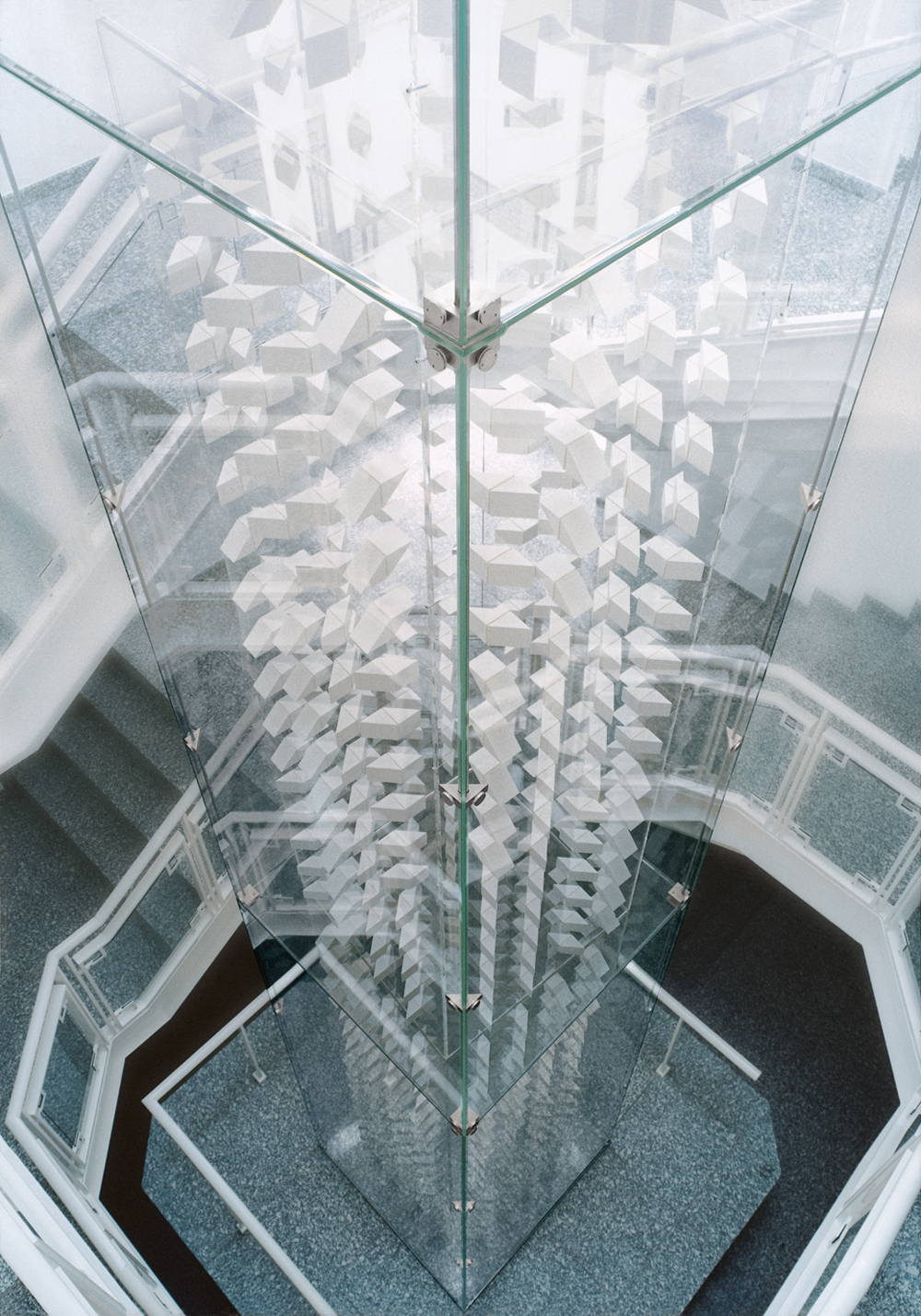 8 »Der Schatten, die Transparenz und Halbtransparenz des Glases und das Weiß sind das verbindende Medium der strukturellen Felder und Schichten meiner plastischen Arbeiten […] Weiß ist die Botschaft der Helligkeit und der Immaterialität. Weiß ist offen für Licht und verändert sich mit seiner Strahlung.« Staudt, Klaus: »Die Farbe Weiß«, 2001, in: Ausst.-Kat. Kunstverein Speyer 2007 (wie Anm. 3), S. 82.